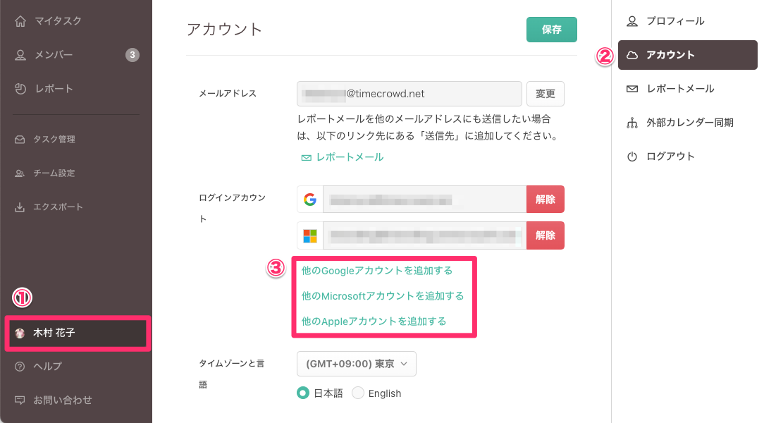 ①個人設定>②アカウントにアクセスし、③各種ログインアカウントの追加ボタンをクリックします。