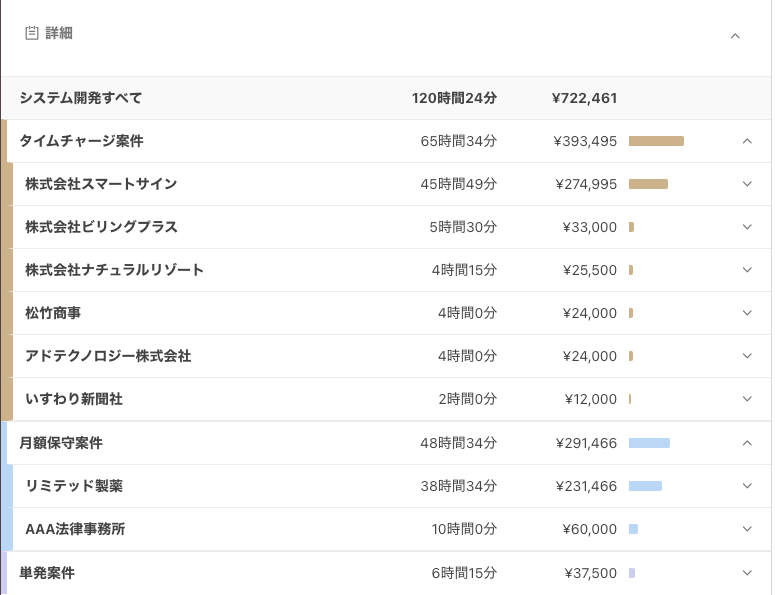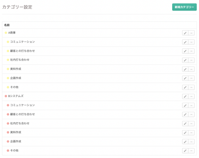 以下のように、カテゴリー名に顧客やプロジェクトの名前をつけることで、顧客ごとのレポートを出すことが可能です。