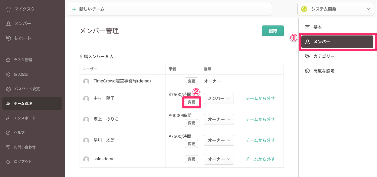 「メンバーごとの単価設定」は「チーム設定」内の「メンバー」にて設定が可能です。