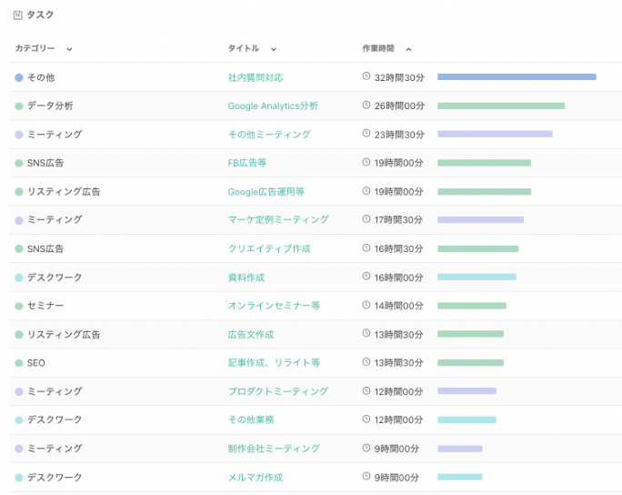以下が業務の種類ごとの稼働時間数を一覧で見ることができるレポートの例です。