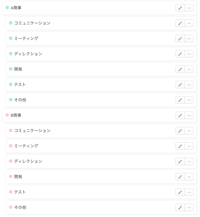 顧客・プロジェクトごとだけでなく、「打ち合わせ」や「資料作成」などより詳細な業務の内訳も把握したい場合は、以下のようなカテゴリー分けも考えられます。