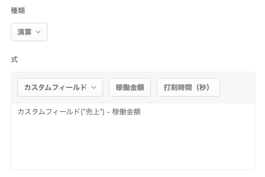 カスタムフィールドの種類で「演算」を選択すると、演算式の入力フィールドが表示されます。