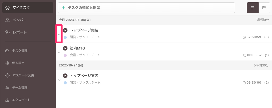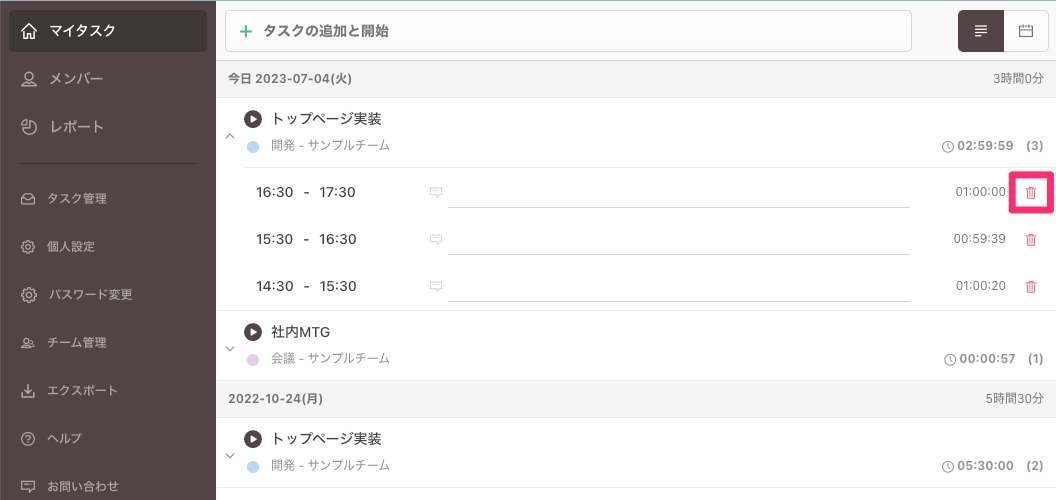 2. タスクごとの作業履歴一覧から選択して削除する